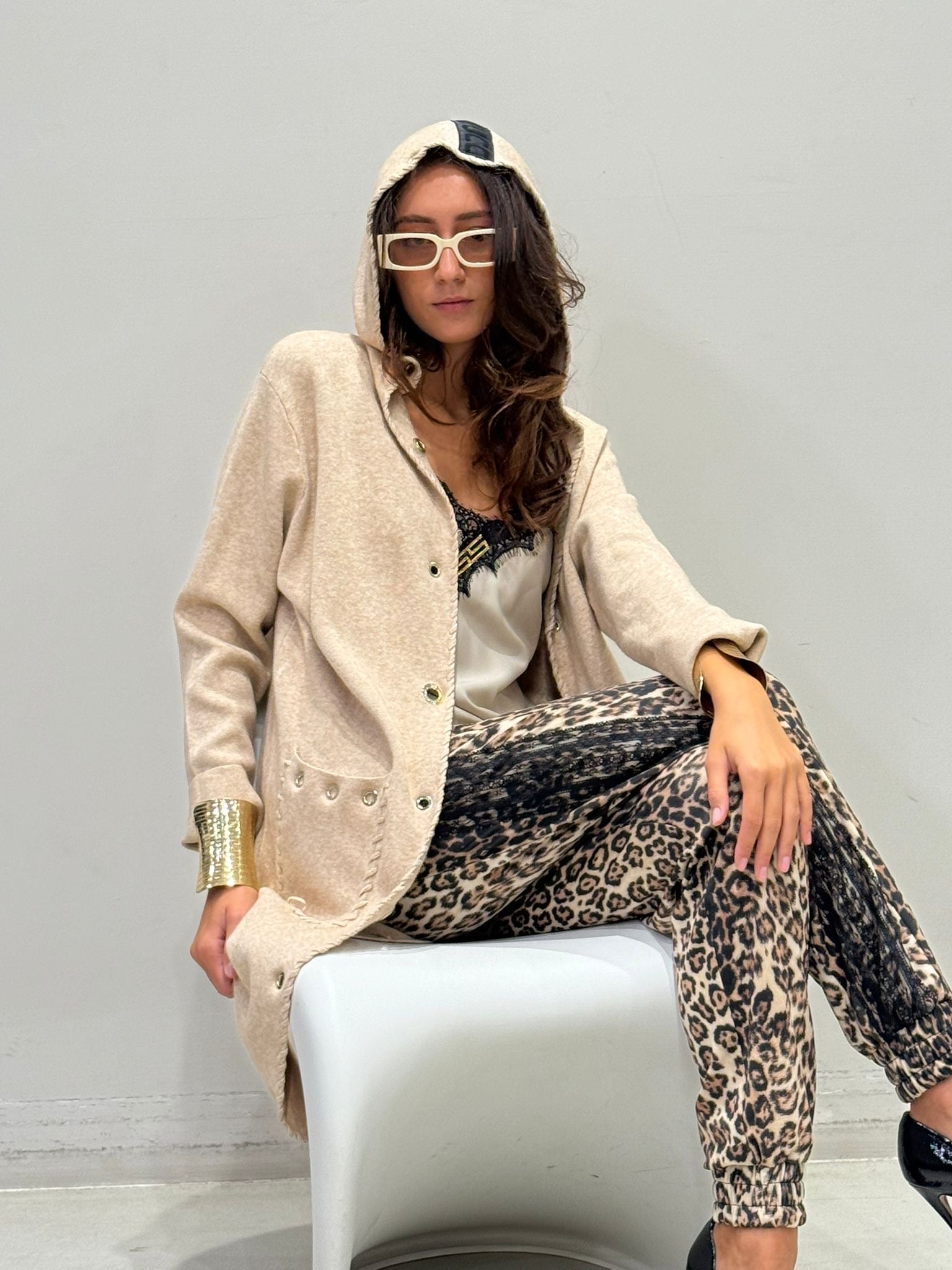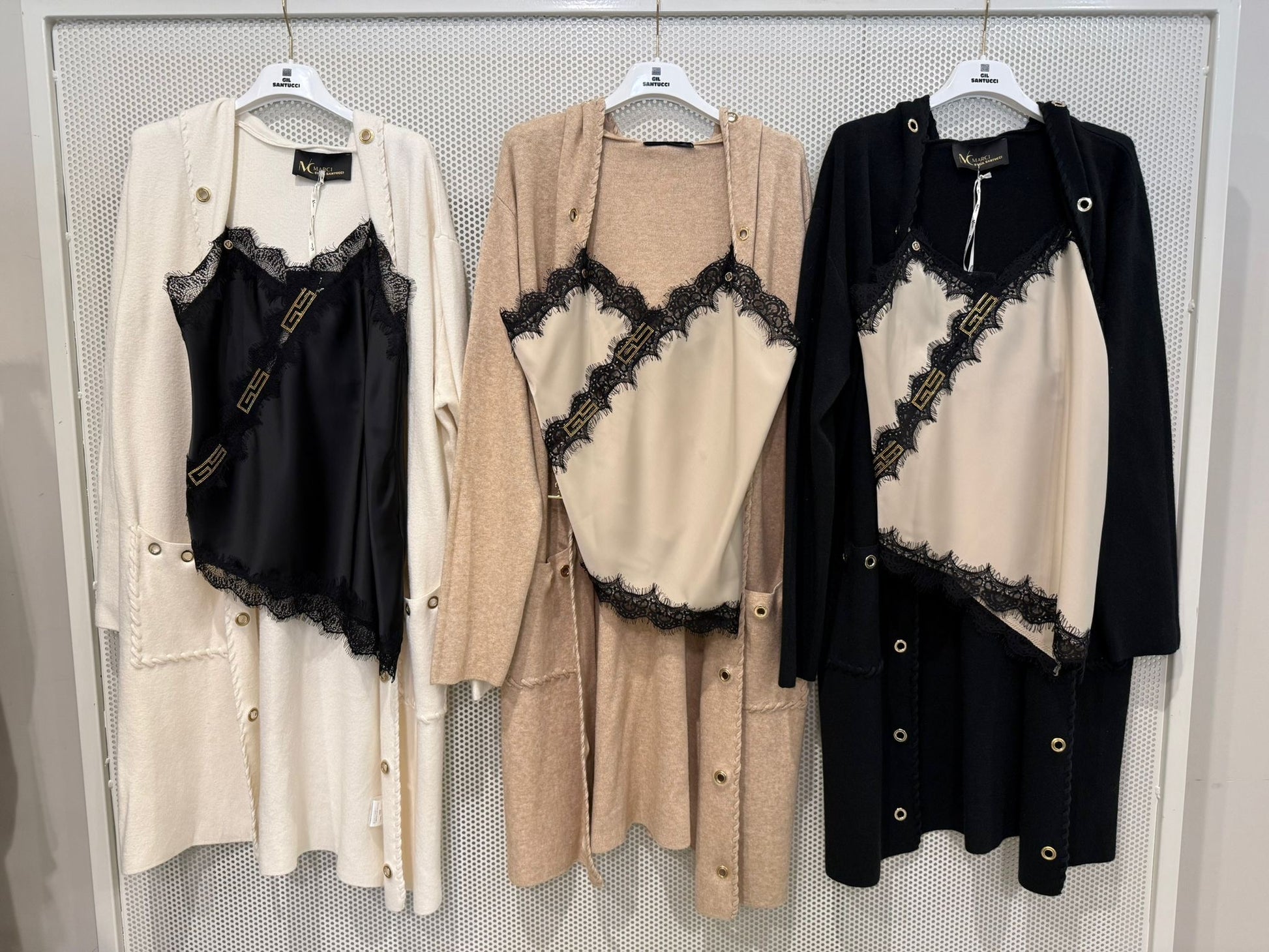 Elegantes Zweiteiler-Set bestehend aus einer weichen, feingestrickten Long-Cardigan und einem luxuriösen Satin-Top mit edler Spitzenverzierung. Das Camisole-Top mit goldfarbenem Logoband und feiner Spitze sorgt für einen femininen, raffinierten Look, während die Strickjacke mit goldenen Knöpfen und seitlichen Taschen dem Outfit einen modernen und zugleich gemütlichen Touch verleiht.