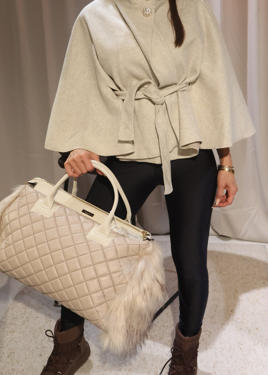 Diese elegante Tasche mit Pelzbesatz an den Seiten ist in Beige und Schwarz erhältlich und verleiht sowohl anspruchsvollen Alltags- als auch entspannten Freizeitlooks eine raffinierte Note. Mit ihrem großzügigen Innenraum bietet sie ausreichend Platz für Trainingsutensilien oder Reiseutensilien, sodass sie ideal als Handtasche für vielfältige Gelegenheiten genutzt werden kann. Ein perfektes Accessoire, das Stil und Funktionalität harmonisch verbindet.